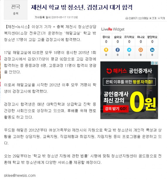 제천시 학교 밖 청소년, 검정고시 대거 합격 페이지 정보 작성자 운영자 댓글 0건 조회 3,941회 작성일 15-05-19 14:33 본문 제천시 학교 밖 청소년, 검정고시 대거 합격 목록 이전글제천시 '학교 밖 청소년' 검정고시 대거 합격 15.05.19 다음글충북도청명학생교육원, 도내 각 시.군 청소년상담복지센터와 업무협약 15.04.07 댓글목록 댓글목록 등록된 댓글이 없습니다.