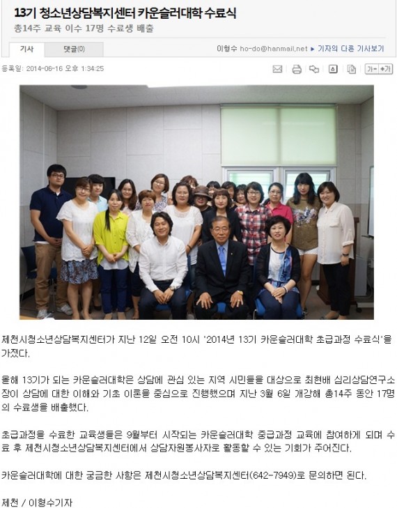 13기 청소년상담복지센터 카운슬러대학 수료식 페이지 정보 작성자 운영자 댓글 0건 조회 4,273회 작성일 14-06-19 11:25 본문 13기 청소년상담복지센터 카운슬러대학 수료식 목록 이전글제천시청소년상담복지센터, 청소년 자살예방지도자 양성교육 14.07.09 다음글제천중학교-청소년상담복지센터와 협약식 14.06.19 댓글목록 댓글목록 등록된 댓글이 없습니다.