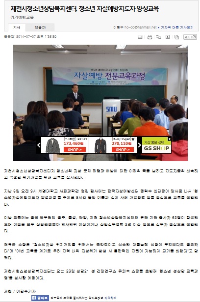 제천시청소년상담복지센터, 청소년 자살예방지도자 양성교육 페이지 정보 작성자 운영자 댓글 0건 조회 4,275회 작성일 14-07-09 09:24 본문 제천시청소년상담복지센터, 청소년 자살예방지도자 양성교육 목록 이전글제천청소년상담복지센터, 진로탐색 프로그램 참가자 모집 14.08.01 다음글13기 청소년상담복지센터 카운슬러대학 수료식 14.06.19 댓글목록 댓글목록 등록된 댓글이 없습니다.