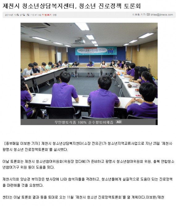 제천시 청소년상담복지센터, 청소년 진로정책 토론회 페이지 정보 작성자 운영자 댓글 0건 조회 4,257회 작성일 14-11-20 17:30 본문 제천시 청소년상담복지센터, 청소년 진로정책 토론회 목록 이전글제천시 청소년 진로정책 토론회 눈길 14.11.20 다음글제천경찰서-제천시청소년상담복지센터 협약 14.11.20 댓글목록 댓글목록 등록된 댓글이 없습니다.