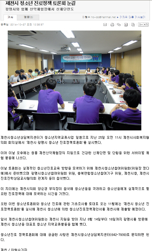 제천시 청소년 진로정책 토론회 눈길 페이지 정보 작성자 운영자 댓글 0건 조회 4,236회 작성일 14-11-20 17:31 본문 제천시 청소년 진로정책 토론회 눈길 목록 이전글청소년 진로정책 토론회 14.11.20 다음글제천시 청소년상담복지센터, 청소년 진로정책 토론회 14.11.20 댓글목록 댓글목록 등록된 댓글이 없습니다.