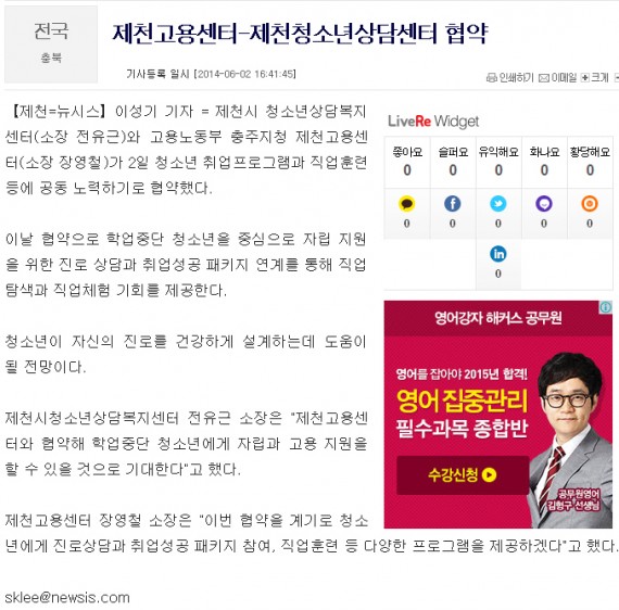 제천고용센터-제천청소년상담센터 협약 페이지 정보 작성자 운영자 댓글 0건 조회 4,408회 작성일 14-06-11 09:21 본문 제천고용센터-제천청소년상담센터 협약 목록 이전글학업중단 청소년 자립 뒷받침 14.06.11 다음글제천시청소년상담복지센터-장락초 협력협약 14.05.23 댓글목록 댓글목록 등록된 댓글이 없습니다.