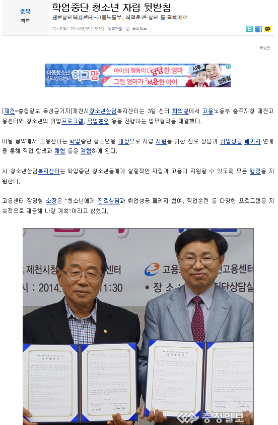 학업중단 청소년 자립 뒷받침 페이지 정보 작성자 운영자 댓글 0건 조회 4,161회 작성일 14-06-11 09:22 본문 학업중단 청소년 자립 뒷받침 목록 이전글제천시청소년상담복지센터 기관단체와 협약으로 힘 얻어 14.06.19 다음글제천고용센터-제천청소년상담센터 협약 14.06.11 댓글목록 댓글목록 등록된 댓글이 없습니다.