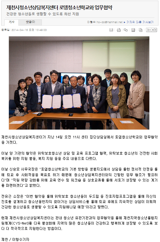 제천시청소년상담복지센터 로뎀청소년학교와 업무협약 페이지 정보 작성자 운영자 댓글 0건 조회 4,654회 작성일 14-05-10 10:57 본문 제천시청소년상담복지센터 로뎀청소년학교와 업무협약 목록 이전글제천시 청소년참여위원회 본격 활동 14.05.10 다음글청소년상담복지센터-제천 보호관찰소 업무협약 14.03.25 댓글목록 댓글목록 등록된 댓글이 없습니다.