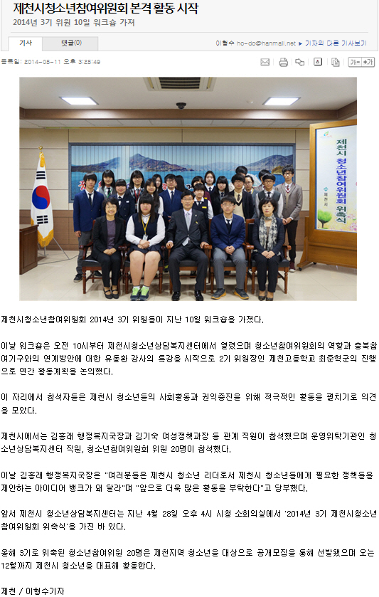 제천시청소년참여위원회 본격 활동 시작 페이지 정보 작성자 운영자 댓글 0건 조회 4,244회 작성일 14-05-13 17:27 본문 제천시청소년참여위원회 본격 활동 시작 목록 이전글제천해밀교실, 청소년 검정고시 13명 합격 14.05.20 다음글제천시 청소년참여위원회 본격 활동 14.05.10 댓글목록 댓글목록 등록된 댓글이 없습니다.
