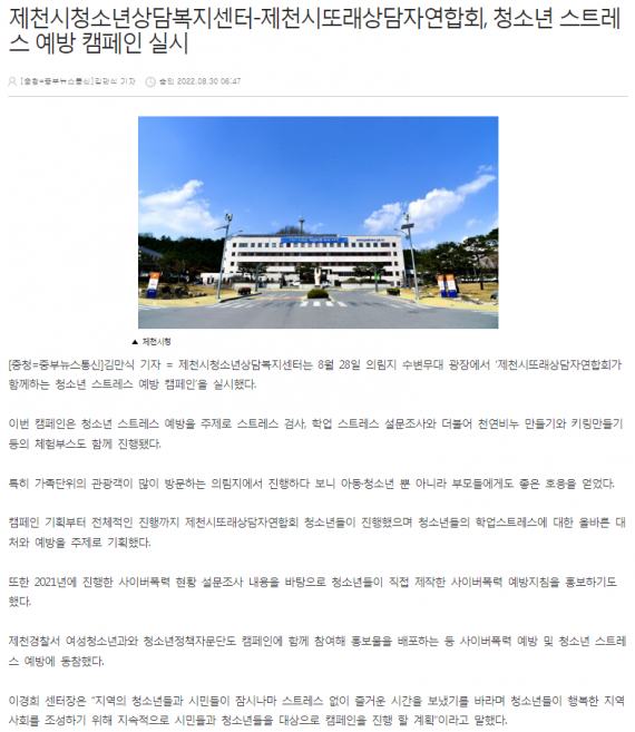 제천시청소년상담복지센터-제천시또래상담자연합회, 청소년 스트레스 예방 캠페인 실시 페이지 정보 작성자 운영자 댓글 0건 조회 2,002회 작성일 22-08-31 15:32 본문 제천시청소년상담복지센터-제천시또래상담자연합회, 청소년 스트레스 예방 캠페인 실시 목록 이전글제천시청소년상담복지센터와 제천시 또래상담자가 함께하는 비대면 또래상담 프로그램 '너의 고민이 보여' 진행 22.10.26 다음글제천시청소년상담복지센터-제천시또래상담자연합회, 청소년 스트레스 예방 캠페인 실시 22.08.31 댓글목록 댓글목록 등록된 댓글이 없습니다.