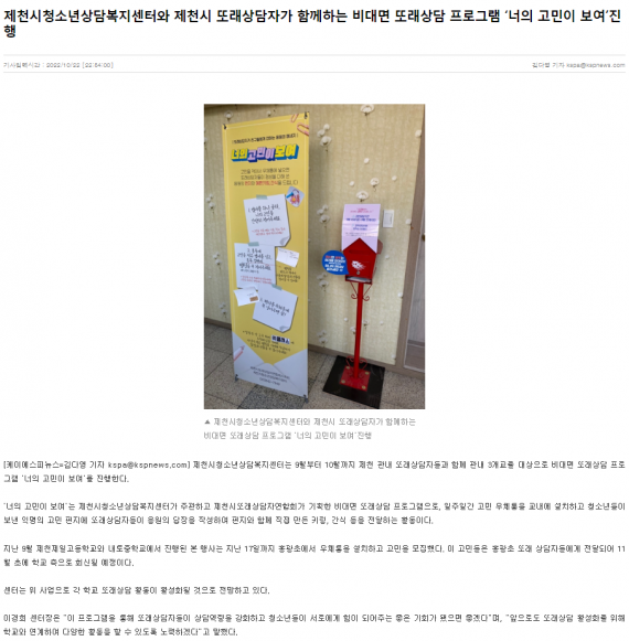 제천시청소년상담복지센터와 제천시 또래상담자가 함께하는 비대면 또래상담 프로그램 '너의 고민이 보여' 진행