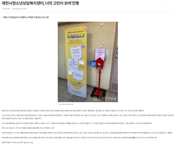 제천시청소년상담복지센터, '너의 고민이 보여' 진행 페이지 정보 작성자 운영자 댓글 0건 조회 1,876회 작성일 22-10-26 10:00 본문 제천시청소년상담복지센터, '너의 고민이 보여' 진행 목록 이전글제천시청소년상담복지센터, 운영보고회 및 꿈드림 졸업식 개최 22.11.29 다음글제천시, 비대면 또래상담 프로그램 '너의 고민이 보여' 운영 22.10.26 댓글목록 댓글목록 등록된 댓글이 없습니다.