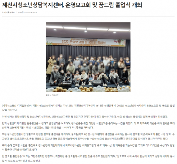 제천시청소년상담복지센터, 운영보고회 및 꿈드림 졸업식 개최 페이지 정보 작성자 운영자 댓글 0건 조회 1,879회 작성일 22-11-29 16:48 본문 제천시청소년상담복지센터, 운영보고회 및 꿈드림 졸업식 개최 목록 이전글제천시청소년상담복지센터, 운영보고회 및 꿈드림 졸업식 개최 22.11.29 다음글제천시청소년상담복지센터, 운영보고회 및 꿈드림 졸업식 개최 22.11.29 댓글목록 댓글목록 등록된 댓글이 없습니다.