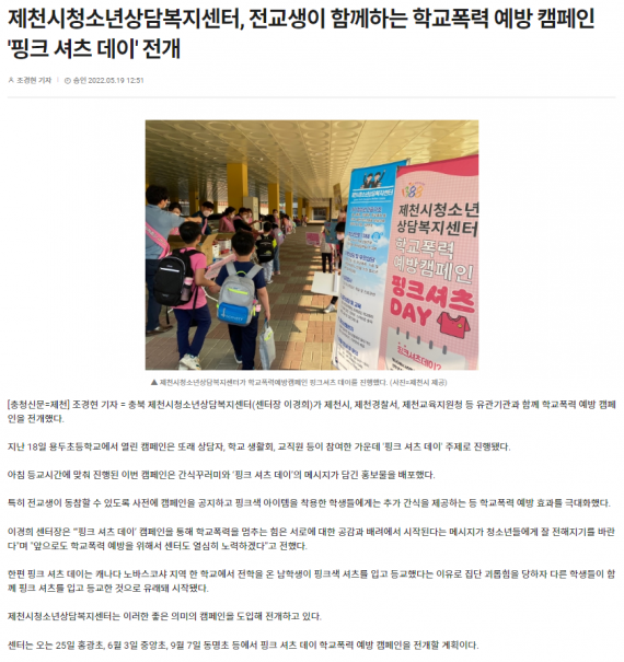 제천시청소년상담복지센터, 전교생이 함께하는 학교폭력 예방 캠페인 '핑크 셔츠 데이' 전개