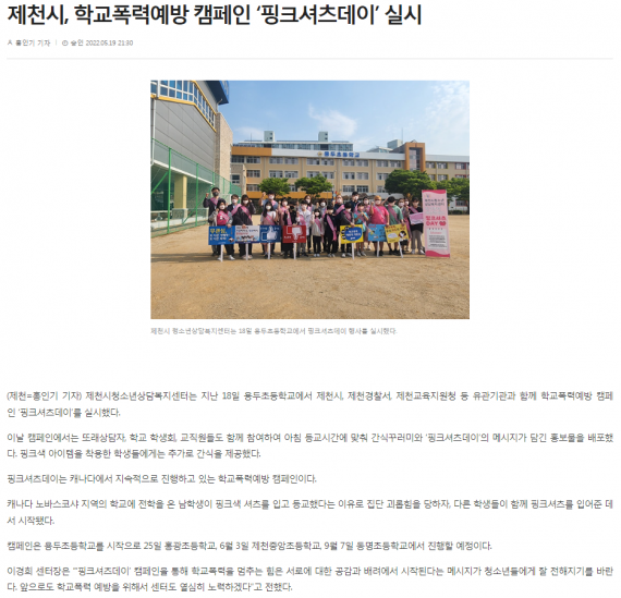 - 다음글제천시청소년상담복지센터, 전교생이 함께하는 학교폭력예방캠페인 '핑크셔츠데이' 실시 22.05.20