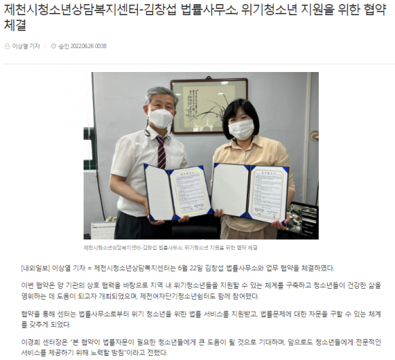 제천시청소년상담복지센터-김창섭 법률사무소, 위기청소년 지원을 위한 협약 체결