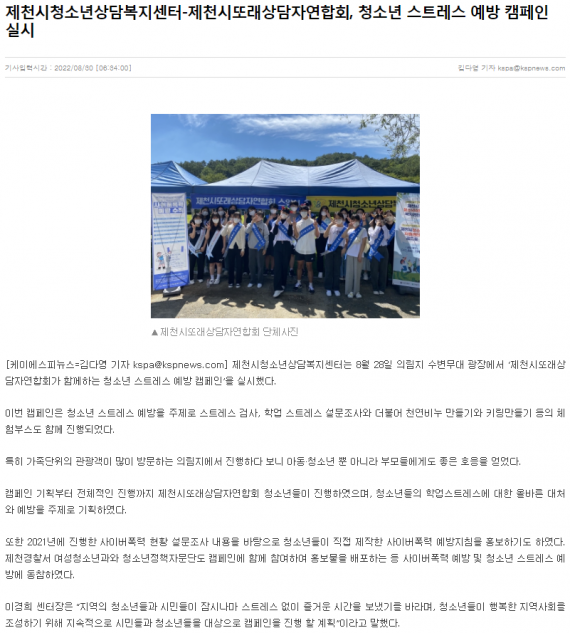 제천시청소년상담복지센터-제천시또래상담자연합회, 청소년 스트레스 예방 캠페인 실시 페이지 정보 작성자 운영자 댓글 0건 조회 1,997회 작성일 22-08-31 15:31 본문 제천시청소년상담복지센터-제천시또래상담자연합회, 청소년 스트레스 예방 캠페인 실시 목록 이전글제천시청소년상담복지센터, 청소년 스트레스 예방 캠페인 실시 22.08.31 다음글제천시청소년상담복지센터, 청소년 스트레스 예방 캠페인 실시 22.08.31 댓글목록 댓글목록 등록된 댓글이 없습니다.