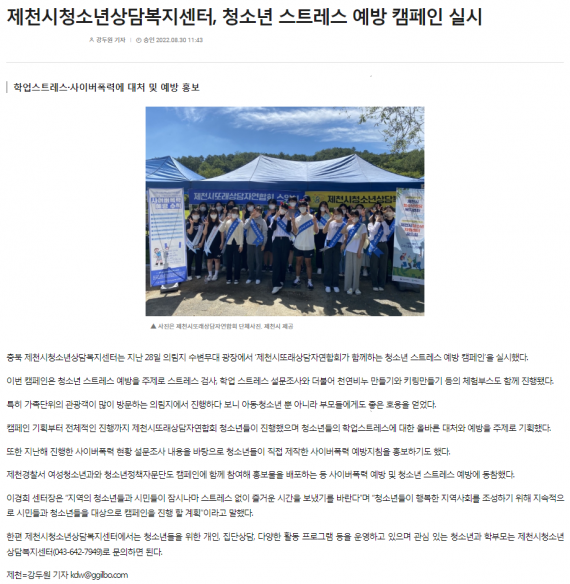 - 다음글제천시청소년상담복지센터-제천시또래상담자연합회, 청소년 스트레스 예방 캠페인 실시 22.08.31