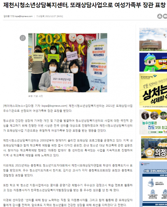 제천시청소년상담복지센터, 또래상담사업으로 여성가족부 장관 표창 페이지 정보 작성자 운영자 댓글 0건 조회 2,277회 작성일 21-12-28 11:06 본문 제천시청소년상담복지센터, 또래상담사업으로 여성가족부 장관 표창 목록 이전글제천시청소년상담복지센터, 또래상담사업으로 여성가족부 장관 표창 21.12.28 다음글제천시청소년상담복지센터, 또래상담사업 장관 표창 수상 21.12.28 댓글목록 댓글목록 등록된 댓글이 없습니다.