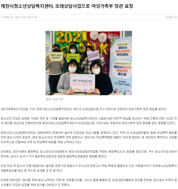 제천시청소년상담복지센터, 또래상담사업으로 여성가족부 장관 표창 페이지 정보 작성자 운영자 댓글 0건 조회 2,314회 작성일 21-12-28 11:10 본문 제천시청소년상담복지센터, 또래상담사업으로 여성가족부 장관 표창 목록 이전글제천시청소년상담복지센터,또래상담사업 여성가족부 장관 표창 21.12.28 다음글제천시청소년상담복지센터, 또래상담사업으로 여성가족부 장관 표창 21.12.28 댓글목록 댓글목록 등록된 댓글이 없습니다.