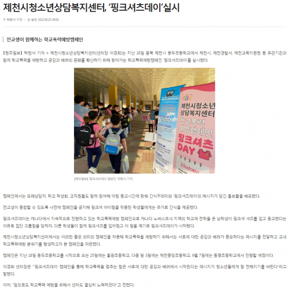 제천시청소년상담복지센터, '핑크셔츠데이' 실시 페이지 정보 작성자 운영자 댓글 0건 조회 2,109회 작성일 22-05-20 09:58 본문 제천시청소년상담복지센터, '핑크셔츠데이' 실시 목록 이전글제천시청소년상담복지센터, '핑크셔츠 데이' 운영 22.05.20 다음글제천시청소년상담복지센터, 여성가족부 장관 표창 받아 21.12.28 댓글목록 댓글목록 등록된 댓글이 없습니다.