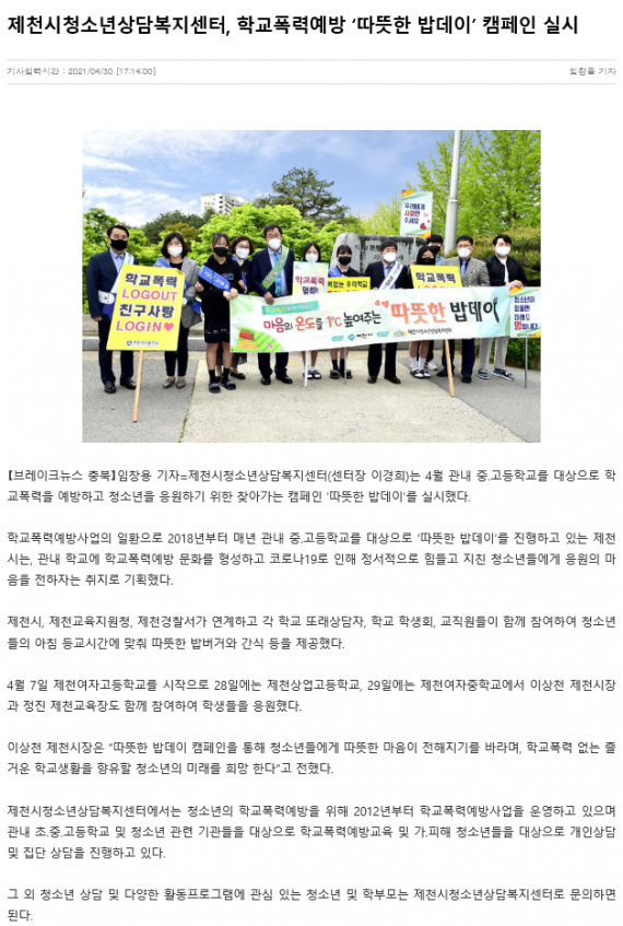 제천시청소년상담복지센터, 학교폭력예방 '따뜻한 밥데이' 캠페인 실시 페이지 정보 작성자 운영자 댓글 0건 조회 2,649회 작성일 21-05-11 09:06 본문 제천시청소년상담복지센터, 학교폭력예방 '따뜻한 밥데이' 캠페인 실시 목록 이전글제천시청소년상담복지센터, 학교폭력예방 '따뜻한 밥데이' 캠페인 실시 21.05.11 다음글제천시청소년상담복지센터, 그래피티 니팅 프로그램 진행 20.12.31 댓글목록 댓글목록 등록된 댓글이 없습니다.
