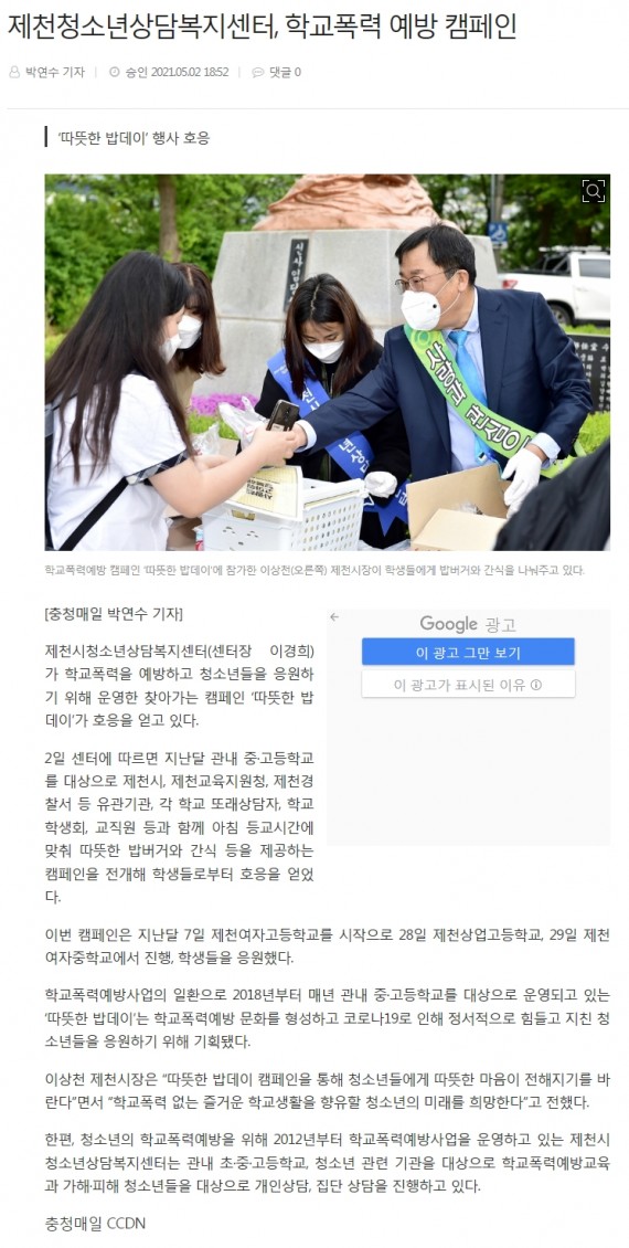 - 이전글제천시청소년상담복지센터, 학교폭력예방 캠페인 '따뜻한 밥데이' 실시 21.05.11