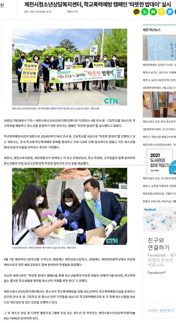 제천시청소년상담복지센터, 학교폭력예방 캠페인 '따뜻한 밥데이' 실시 페이지 정보 작성자 운영자 댓글 0건 조회 2,593회 작성일 21-05-11 18:16 본문 제천시청소년상담복지센터, 학교폭력예방 캠페인 '따뜻한 밥데이' 실시 목록 이전글제천시청소년지원센터 소속 청소년 22명 검정고시 합격 21.05.19 다음글제천청소년상담복지센터, 학교폭력 예방 캠페인 21.05.11 댓글목록 댓글목록 등록된 댓글이 없습니다.