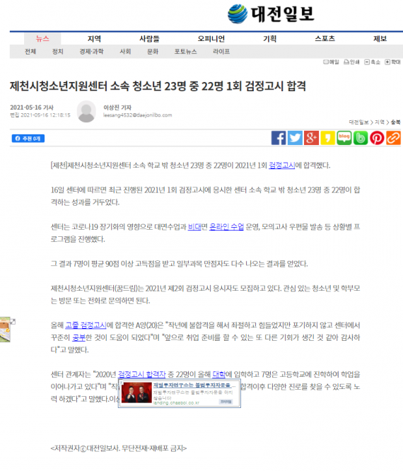 제천시청소년지원센터 소속 청소년 23명 중 22명 1회 검정고시 합격 페이지 정보 작성자 운영자 댓글 0건 조회 2,534회 작성일 21-05-19 17:54 본문 . 목록 이전글제천시청소년지원센터 소속 청소년 22명 검정고시 합격 21.05.19 다음글제천시청소년지원센터 소속 청소년 22명 검정고시 합격 21.05.19 댓글목록 댓글목록 등록된 댓글이 없습니다.