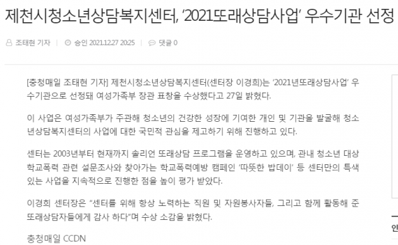 제천시청소년상담복지센터, '2021또래상담사업' 우수기관 선정