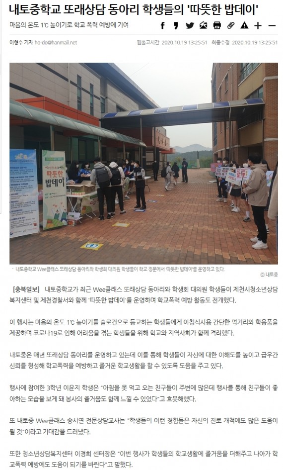 내토중학교 또래상담 동아리 학생들의 '따뜻한 밥데이' 페이지 정보 작성자 운영자 댓글 0건 조회 2,859회 작성일 20-11-03 17:56 본문 내토중학교 또래상담 동아리 학생들의 '따뜻한 밥데이' 목록 이전글내토중학교 Wee클래스 '또래상담 따뜻한 밥데이' 운영 20.11.03 다음글제천시 청소년지원센터 꿈드림, 검정고시 64명 합격 20.10.08 댓글목록 댓글목록 등록된 댓글이 없습니다.