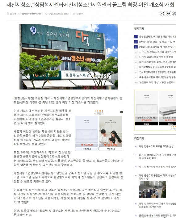 제천시청소년상담복지센터.제천시청소년지원센터 꿈드림 확장 이전 개소식 개최 페이지 정보 작성자 운영자 댓글 0건 조회 3,010회 작성일 20-08-06 10:52 본문 제천시청소년상담복지센터.제천시청소년지원센터 꿈드림 확장 이전 개소식 개최 목록 이전글청소년들 건강한 성장 돕는다 20.08.06 다음글제천시청소년상담복지센터.꿈드림 확장 이전 20.08.06 댓글목록 댓글목록 등록된 댓글이 없습니다.