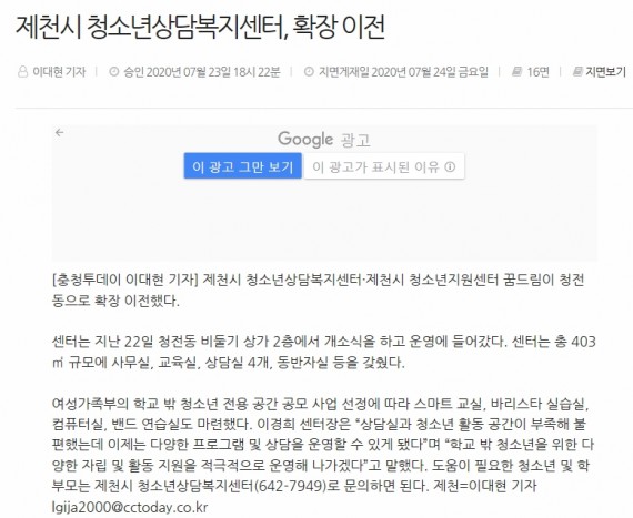 제천시청소년상담복지센터, 확장 이전 페이지 정보 작성자 운영자 댓글 0건 조회 2,843회 작성일 20-08-06 10:53 본문 제천시청소년상담복지센터, 확장 이전 목록 이전글제천시청소년상담복지센터 및 제천시청소년지원센터 꿈드림 확장 이전 개소식 개최 20.08.06 다음글청소년들 건강한 성장 돕는다 20.08.06 댓글목록 댓글목록 등록된 댓글이 없습니다.
