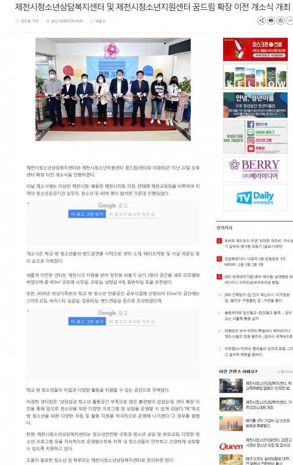 - 다음글제천시청소년상담복지센터 및 제천시청소년지원센터 꿈드림 확장 이전 개소식 개최 20.08.06