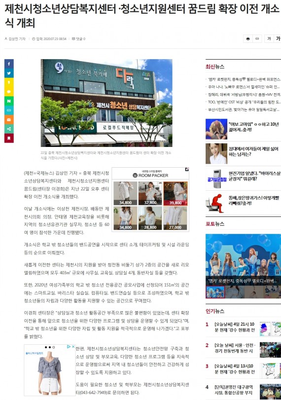 제천시청소년상담복지센터.청소년지원센터 꿈드림 확장 이전 개소식 개최 페이지 정보 작성자 운영자 댓글 0건 조회 2,920회 작성일 20-08-06 10:55 본문 제천시청소년상담복지센터.청소년지원센터 꿈드림 확장 이전 개소식 개최 목록 이전글제천시, 꿈드림 확장 이전 개소식 개최 20.08.06 다음글제천시청소년상담복지센터 및 제천시청소년지원센터 꿈드림 확장 이전 개소식 개최 20.08.06 댓글목록 댓글목록 등록된 댓글이 없습니다.