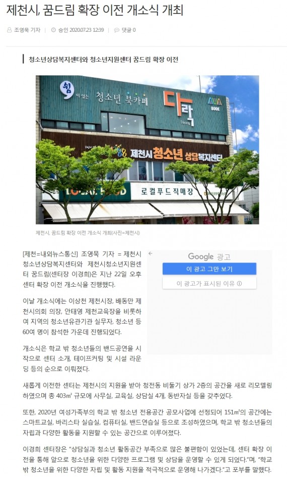 제천시, 꿈드림 확장 이전 개소식 개최 페이지 정보 작성자 운영자 댓글 0건 조회 2,914회 작성일 20-08-06 10:56 본문 제천시, 꿈드림 확장 이전 개소식 개최 목록 이전글청소년지원센터 꿈드림 이전 개소 20.08.06 다음글청소년들의 꿈을 응원합니다-제천시청소년상담복지센터와 지원센터 확장 이전 개소 20.08.06 댓글목록 댓글목록 등록된 댓글이 없습니다.