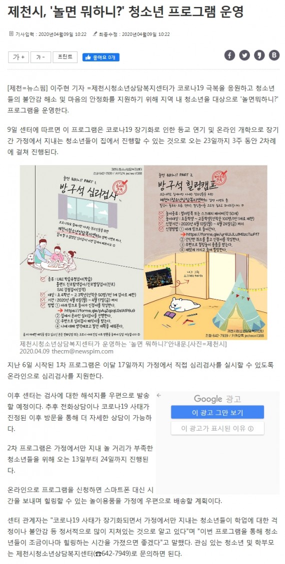 제천시, '놀면 뭐하니?' 청소년 프로그램 운영 페이지 정보 작성자 운영자 댓글 0건 조회 3,412회 작성일 20-04-10 10:02 본문 제천시, '놀면 뭐하니?' 청소년 프로그램 운영 목록 이전글제천시청소년상담복지센터, 청소년 프로그램 운영 20.04.10 다음글제천시청소년상담복지센터, '놀면 뭐하니?' 프로그램 운영 20.04.10 댓글목록 댓글목록 등록된 댓글이 없습니다.