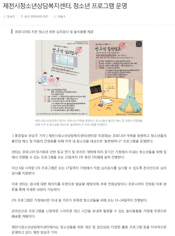 제천시청소년상담복지센터, 청소년 프로그램 운영 페이지 정보 작성자 운영자 댓글 0건 조회 3,398회 작성일 20-04-10 10:02 본문 제천시청소년상담복지센터, 청소년 프로그램 운영 목록 이전글제천시청소년상담복지센터, 놀면 뭐하니? 프로그램 운영 20.04.10 다음글제천시, '놀면 뭐하니?' 청소년 프로그램 운영 20.04.10 댓글목록 댓글목록 등록된 댓글이 없습니다.