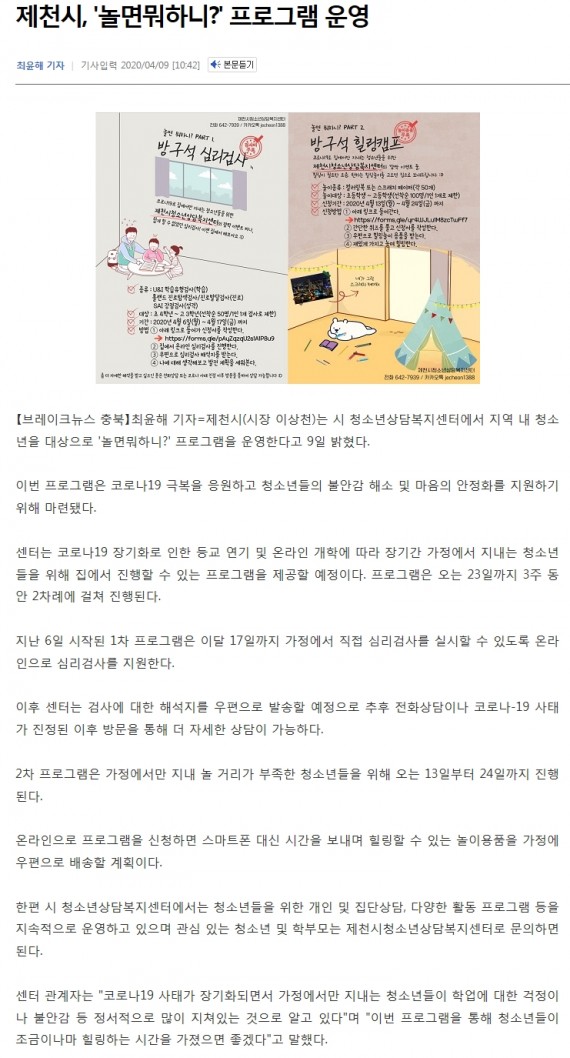 제천시, 놀면뭐하니? 프로그램 운영 페이지 정보 작성자 운영자 댓글 0건 조회 3,438회 작성일 20-04-10 10:03 본문 제천시, 놀면뭐하니? 프로그램 운영 목록 이전글제천시청소년상담복지센터, 놀면뭐하니? 프로그램 운영 20.04.10 다음글제천시청소년상담복지센터, 놀면 뭐하니? 프로그램 운영 20.04.10 댓글목록 댓글목록 등록된 댓글이 없습니다.