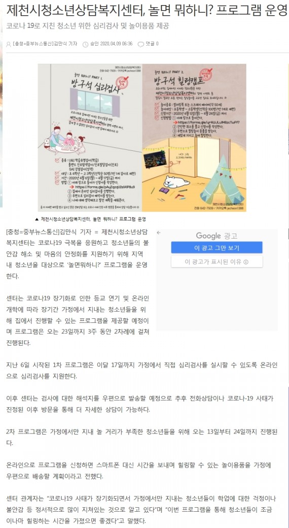 제천시청소년상담복지센터, 놀면뭐하니? 프로그램 운영 페이지 정보 작성자 운영자 댓글 0건 조회 3,674회 작성일 20-04-10 10:04 본문 제천시청소년상담복지센터, 놀면뭐하니? 프로그램 운영 목록 이전글제천시청소년상담복지센터, '놀면 뭐하니' 프로그램 운영 20.04.10 다음글제천시청소년상담복지센터, 놀면뭐하니? 프로그램 운영 20.04.10 댓글목록 댓글목록 등록된 댓글이 없습니다.