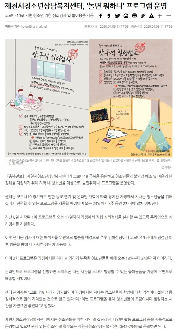 제천시청소년상담복지센터, '놀면 뭐하니' 프로그램 운영 페이지 정보 작성자 운영자 댓글 0건 조회 3,720회 작성일 20-04-10 10:04 본문 제천시청소년상담복지센터, '놀면 뭐하니' 프로그램 운영 목록 이전글제천시청소년상담복지센터, '놀면 뭐하니?' 프로그램 운영 20.04.10 다음글제천시청소년상담복지센터, 놀면뭐하니? 프로그램 운영 20.04.10 댓글목록 댓글목록 등록된 댓글이 없습니다.