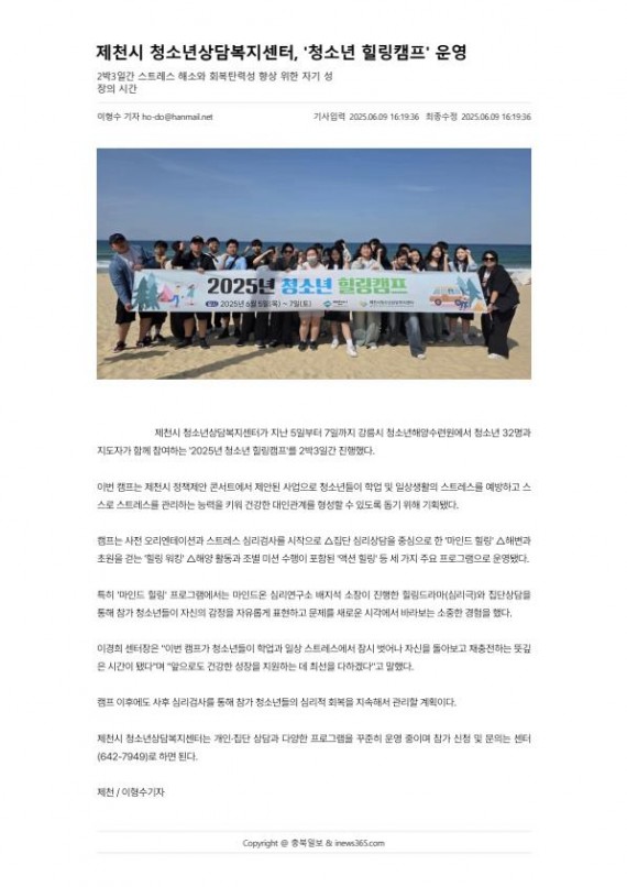 제천시청소년상담복지센터, '청소년 힐링캠프' 운영 페이지 정보 작성자 운영자 댓글 0건 조회 681회 작성일 25-06-24 15:03 본문 제천시청소년상담복지센터, '청소년 힐링캠프' 운영 목록 다음글제천시청소년상담센터, '청소년 힐링캠프' 운영 25.06.24 댓글목록 댓글목록 등록된 댓글이 없습니다.