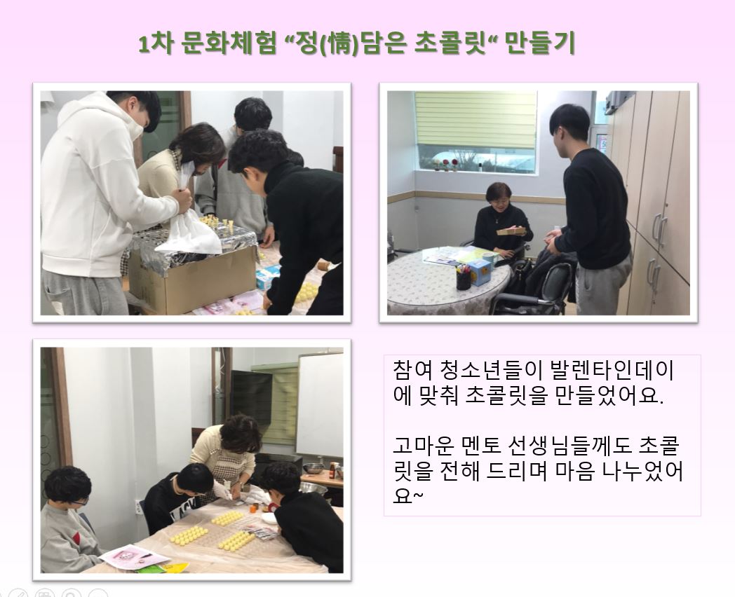 1차 문화체험 「정(情)담은 초콜릿 만들기」 페이지 정보 작성자 운영자 댓글 0건 조회 1,333회 작성일 19-03-05 13:59 본문 참여 청소년들과 함께 문화체험을 통해 정서함양과 소통의 의미를 배우는 과정을 하고 있습니다. 목록 댓글목록 댓글목록 등록된 댓글이 없습니다.