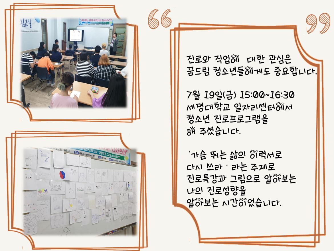 꿈드림 진로컨설팅 세명대학교 '대학일자리센터'에서 청소년 진로프로그램을 하였습니다.