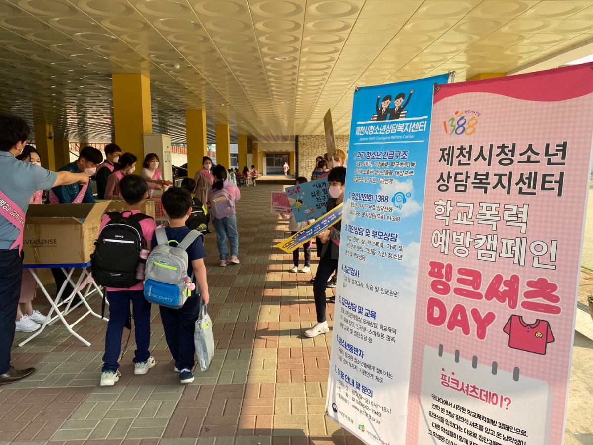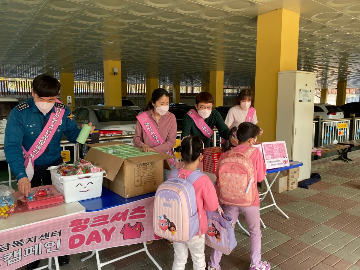 5월 18일에는 용두초등학교 정문에서첫 번째 핑크셔츠데이를 진행했어요!