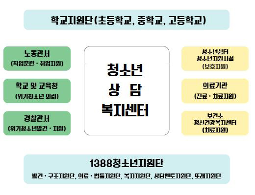 - ㆍ1388청소년지원단 : 발견·구조지원단, 의료·법률지원단, 복지지원단, 상담멘토지원단, 또래지원단